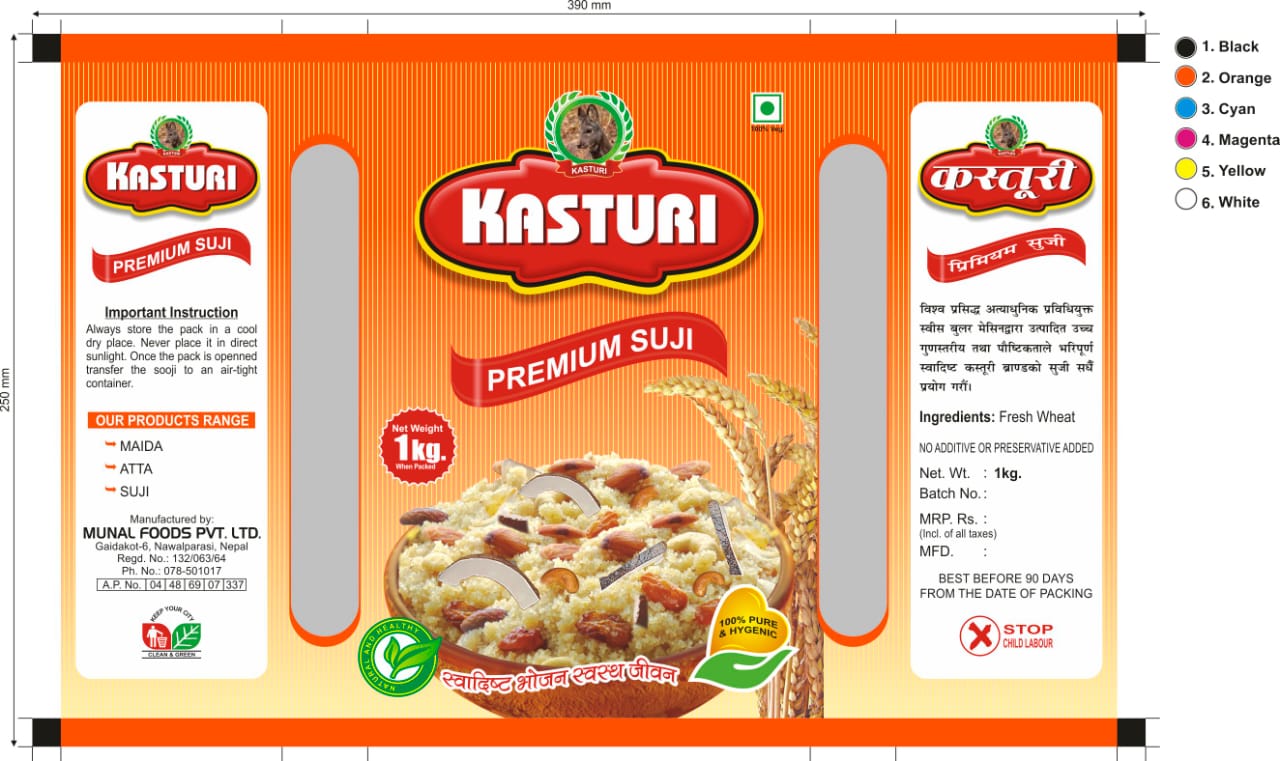 Kasturi Premium Suji manufactured by Munal Foods Pvt. Ltd. produced from Fresh Wheat.