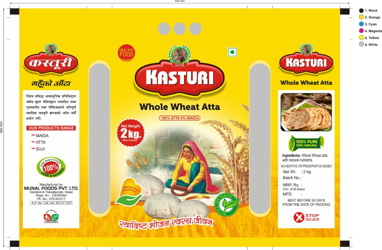 Kasturi Premium Aata. Using Buhler Technology, Munal Foods produces flour containing Iron, Folic Acid and Vitamin 'A'.